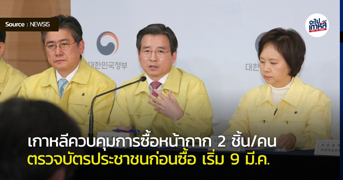 รัฐบาลเกาหลีออกมาตรการจัดจำหน่ายหน้ากากอนามัยจากภาครัฐ โดยจำกัดการซื้อได้คนละไม่เกิน 2 ชิ้นต่อสัปดาห์ เตรียมกระจายไปยังร้านขายยา ไปรษณีย์ และซุปเปอร์มาเก็ต รวมถึงประกาศห้ามส่งออกหน้ากากอนามัยไปต่างประเทศ